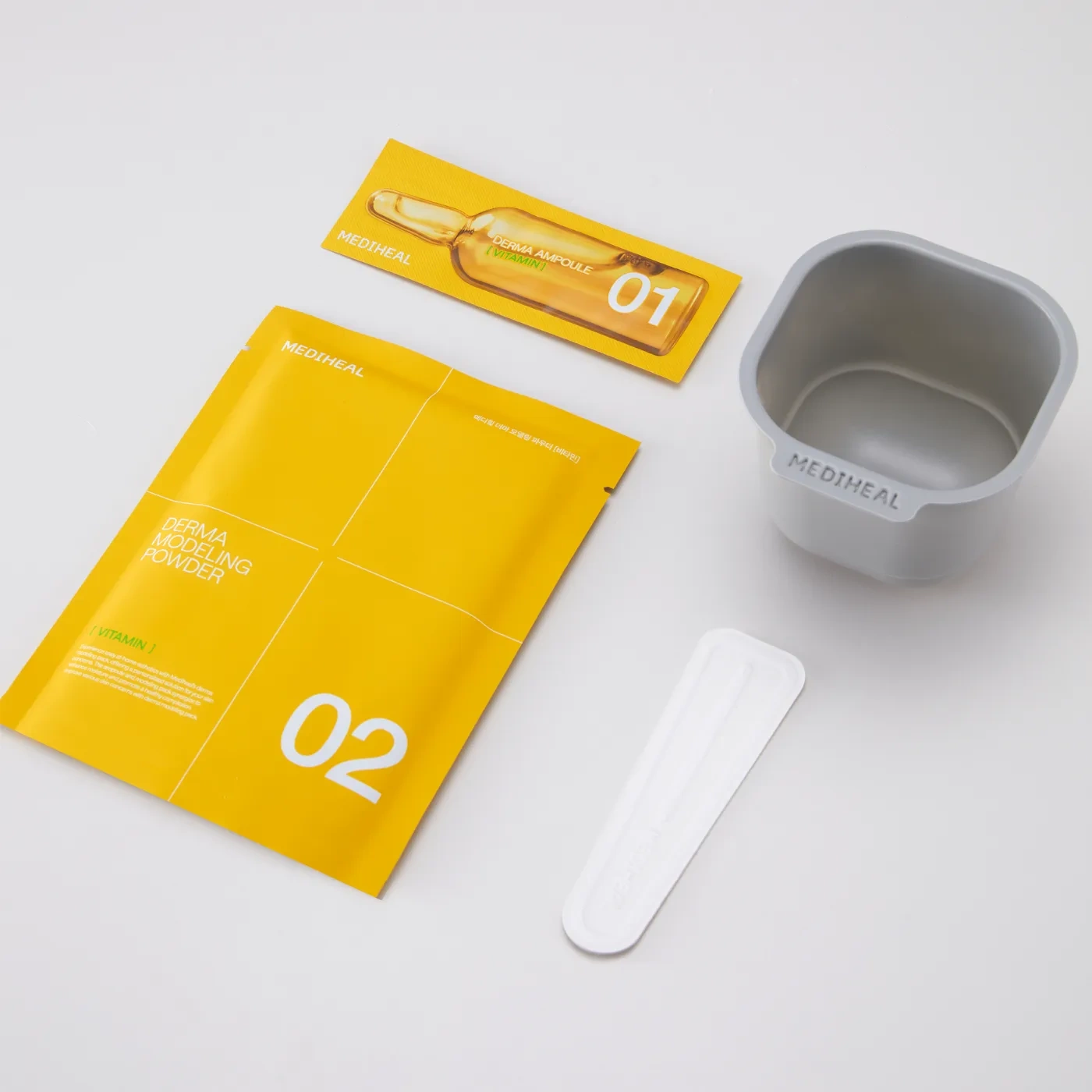 Mediheal Derma Modeling Powder [Vitamin]: Diatomaceous Earth, Glucose, Algin, Calcium Sulfate, Kaolin, Trehalose, Betaine, Xylitol, Panthenol (5,000 ppm), Sodium Benzoate, Sodium Dehydroacetate, Water, Ascorbic Acid (1,000 ppm), Niacinamide (1,000 ppm), Allantoin, Sodium Hyaluronate, Hippophae Rhamnoides Water (980 ppm), Gardenia Florida Fruit Extract, Tetrasodium Pyrophosphate, Dextrin, 1,2-Hexanediol, Glycerin, Citrus Aurantifolia (Lime) Fruit Extract, Citrus Paradisi (Grapefruit) Fruit Extract, Glutathione, Citrus Limon (Lemon) Fruit Extract.