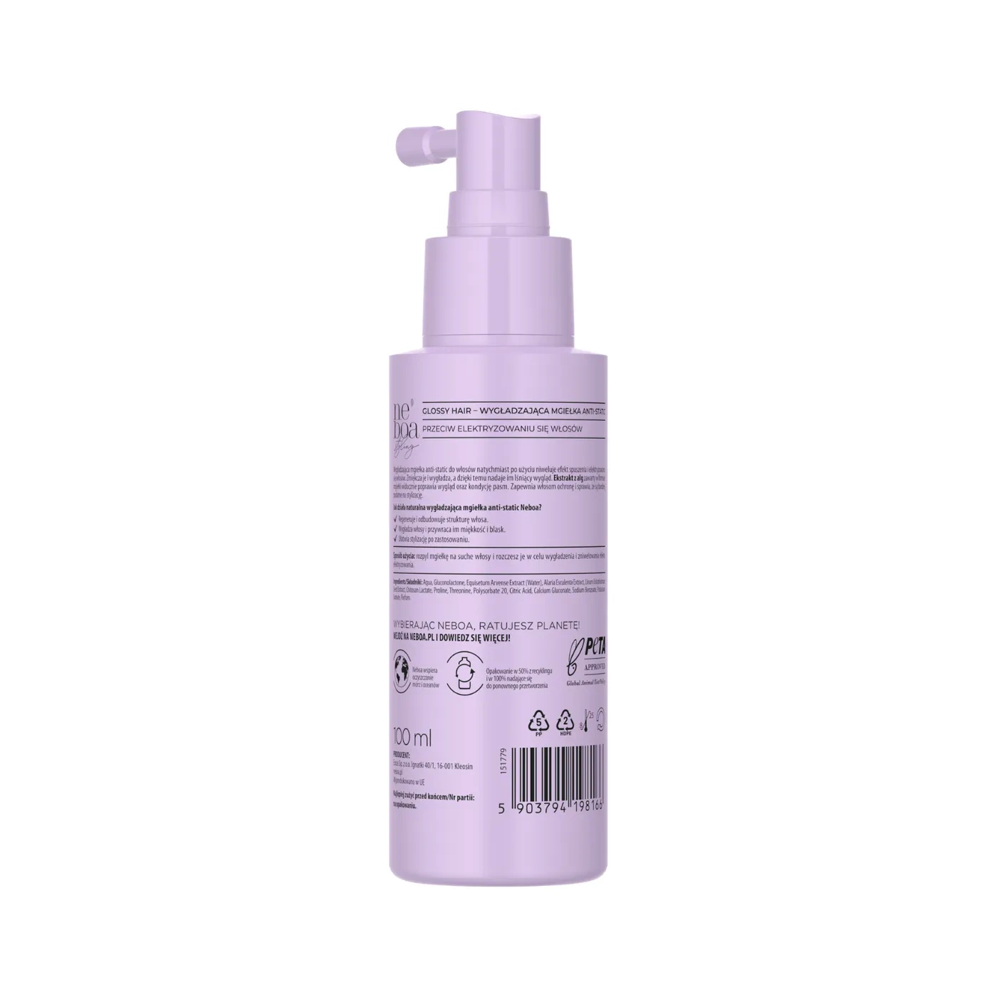 Spray wygładzający Glossy Hair natychmiast po użyciu niweluje efekt spuszenia i elektryzowania się włosów. Zmiękcza je, wygładza, przywraca miękkość i ich naturalny blask. Regeneruje oraz odbudowuje strukturę włosa. Dodatkowo po zastosowaniu ułatwia stylizację. Spray przeciw elektryzowaniu się włosów zawiera ekstrakt z alg, który widocznie poprawia kondycje pasm oraz ich wygląd. Zapewnia włosom ochronę, a także sprawia, że są bardziej podatne na stylizację. Naturalny spray wygładzający Neboa Glossy Hair jest wegański i zawiera aż 98% składników pochodzenia naturalnego. Odpowiedni dla każdego rodzaju włosów.