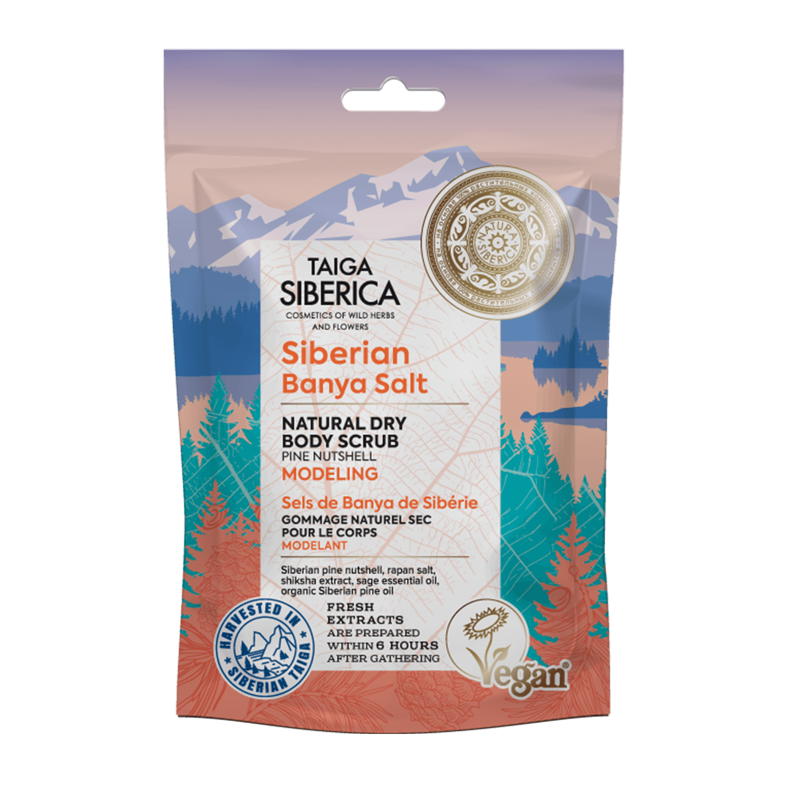 Naturalny suchy peeling do ciała to kombinacja roślin z Tajgi, olejków i naturalnych złuszczających cząsteczek. Zapewnia efekt mikromasażu, aktywnie odnawiając, ujędrniając i odżywiając skórę. Łupiny orzechów sosny syberyjskiej delikatnie złuszczają skórę, pozostawiając ją gładką i miękką w dotyku. Sól z Rapan pomaga zregenerować skórę, a ekstrakt z bażyny czarnej zawiera kwas kawowy, który tonizuje skórę i poprawia jej elastyczność. Olejek z szałwii to źródło witamin A, E i potasu, które odżywiają skórę i napełniają ją energią. Organiczny olej z sosny syberyjskiej - naturalne źródło kwasów Omega 3-6-9 i witaminy E poprawia koloryt skóry.
